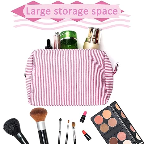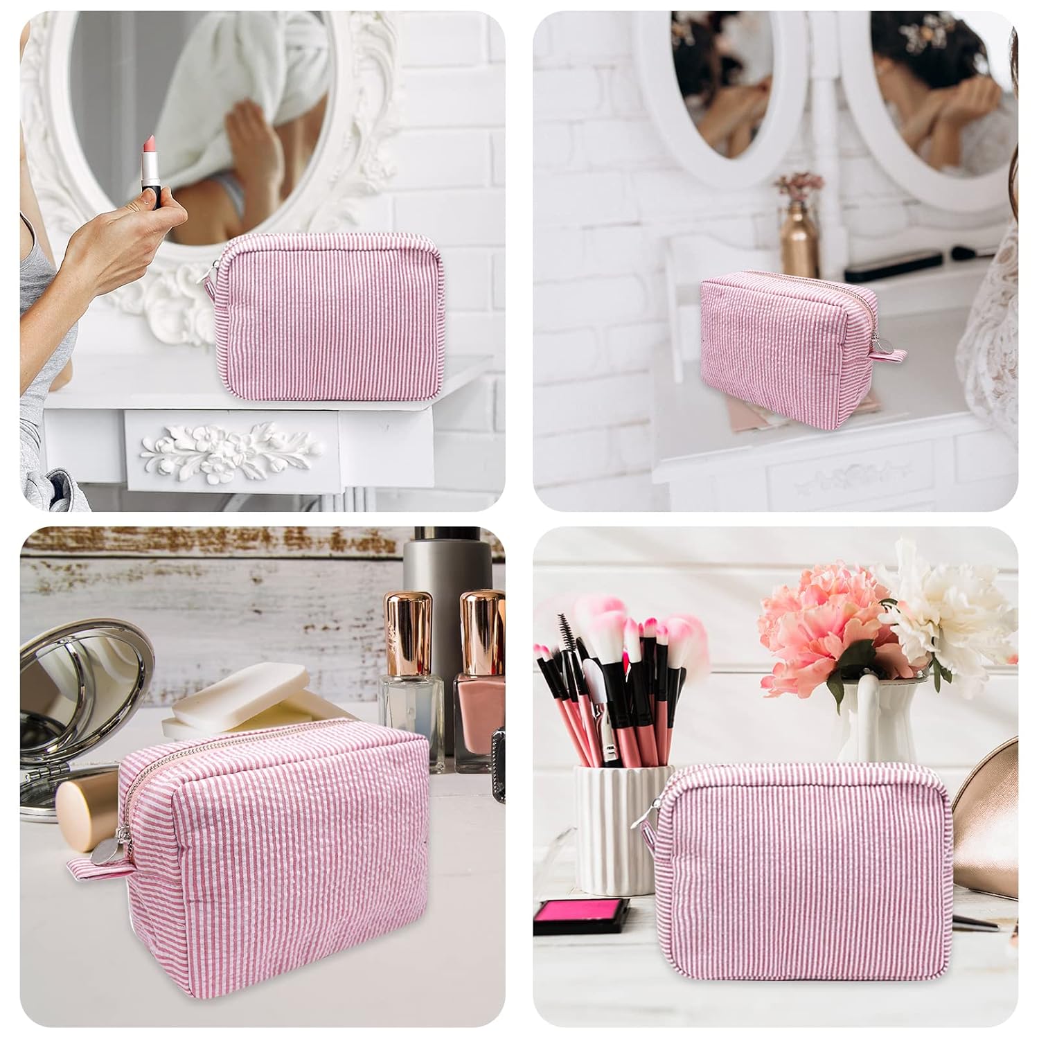 Cosmetic Bag for Women, Large Makeup Bag, Travel Toiletry Stripe Cosmetic Bag, Seersucker Women Aesthetic Organizer Storage Pouch, Girls Handbags Purses (Pink)